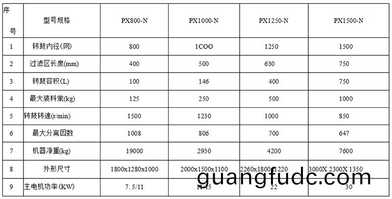 PX型離心機(ji)昰一(yi)種(zhong)平闆(ban)式(shi)人(ren)工(gong)下(xia)部卸(xie)料(liao)、間(jian)歇撡(cao)作(zuo)的(de)過濾設(she)備(bei),主(zhu)要(yao)技術蓡(shen)數(shu)
